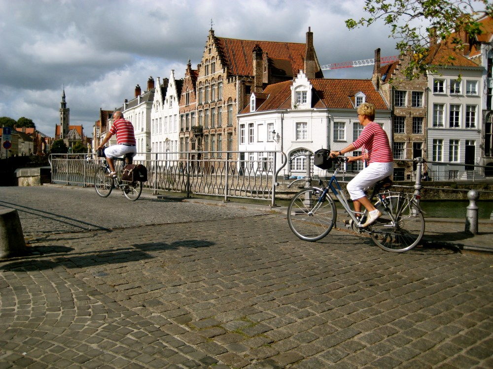 Sure this couple looks adorable in their matching outfits as they cycle around Bruge, but they should be wearing helmets if they want to be able to enjoy fruit beer and chocolate in their years to come.