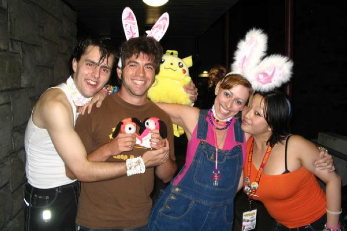 Sparkle Bunny at the Victoria Fringe in 2005 with her stage manager in the brown shirt and box office volunteers that dressed up for her show! PLUR 4EVAH!