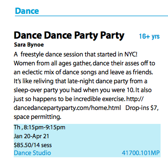Starting January 20, 2011 Dance Dance Party Party will be up for it’s fourth season of awesomeness. This is the first time the class will have ran in the Winter session and I’m super pumped to get some new ladies out who want to exersize and have fun while they’re doing it. DDPP isn’t like most exercise classes; here the goal is fun first, cardio second.