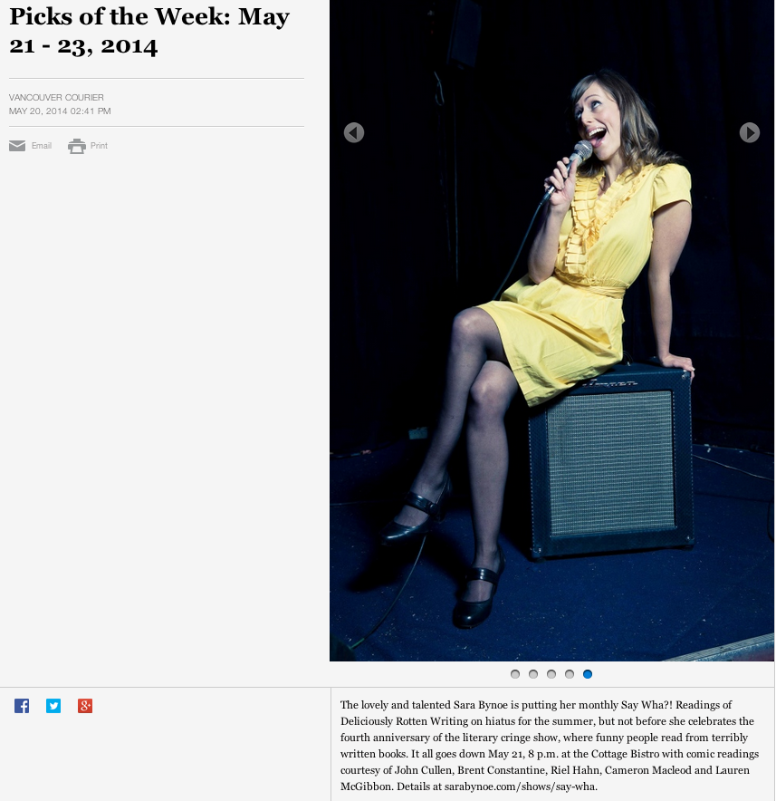 Tonight is my last show that I’m producing in Vancouver until the fall. Why? I’m going to Toronto for June, July and August. Why am I going to Toronto? Many reasons. I’ll share them in a few days. But now I’d like to draw your attention to the wonderful support I’ve received from local media for tonight’s Four Year Anniversary Show of Say Wha?! Readings of Deliciously Rotten Writing.