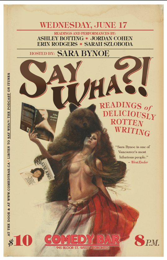 Say Wha?! Readings of Deliciously Rotten Writing is a comedy show where funny people read from the WORST books they can find.
