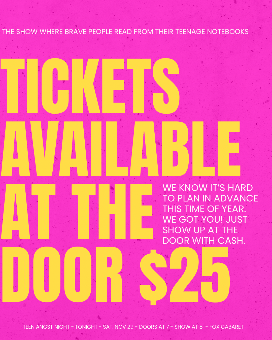 Fear not, last minute planners, there are tickets available at the door tonight! Online sales have ended so that I can prepare for the show. Just bring cash to the Fox Cabaret and you will be permitted entry to the show/ celebration of 25 years of Teen Angst Night.